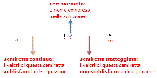 Una retta orientata viene divisa in due semirette (una continua e l'altra tratteggiata) aventi l'origine in comune. Tutti i punti della semiretta continua rappresentano la soluzione della disequazione lineare. L'origine comune alle due semirette è contrassegnata da un cerchietto pieno se il corrispondente valore soddisfa la disequazione, da un cerchietto vuoto se tale valore non soddisfa la disequazione. La semiretta tratteggiata rappresenta invece tutti i valori che non soddisfano la disequazione. Ad esempio, la soluzione x < 1 che soddisfa la nostra disequazione è rappresentata dalla linea coontinua che va da 1 (non incluso) a meno infinito. Sul valore 1 c'è un cerchietto vuoto perchè 1 non è compreso nella soluzione della disequazione. La linea tratteggiata va da 1 (incluso) a più infinito; tutti questi valori non soddisfano la disequazione.