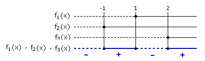 Ora, il segno del prodotto di tre numeri è determinato, per la regola dei segni, dal segno che ciascun fattore assume. Indichiamo con f1(x), f2(x), f3(x) i tre fattori: