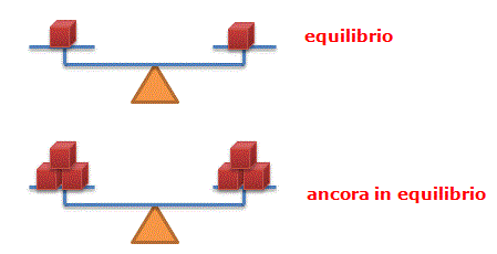 Se la bilancia è in equilibrio, sarà ancora in equilibrio raddoppiando, triplicando, quadruplicando (oppure dimezzando, dividendo per tre, dividendo per quattro) i pesi disposti su ciascun piatto (secondo principio).