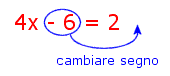 Ad esempio, applichiamo questa regola all'equazione: 4x − 6 = 2 e trasportiamo il termine −6 dal primo al secondo membro: