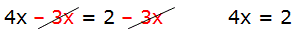 Ad esempio, applichiamo questa regola all'equazione: 4x − 3x = 2 − 3x e eliminiamo i termine −3x presenti nel primo e nel secondo membro: