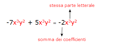 la somma di due monomi si può eseguire solo se i monomi sono simili e il risultato si ottiene sommando algebricamente i coefficienti lasciando invariata la parte letterale.