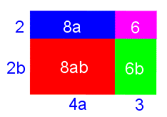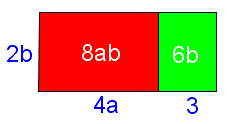 può essere interpretato come l'area di un rettangolo con l'altezza e la base che misurano rispettivamente 2b e (4a + 3). Lo stesso rettangolo si può scomporre in due rettangoli, il primo (quello rosso) di dimensioni 2b e 4a, il secondo (quello verde) di dimensioni 2b e 3