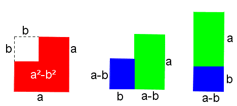 Giustificazione geometrica di questa regola: il quadrato rosso di lato a privato del quadratino di lato b, avente l'area uguale a a2-b2, è equivalente al rettangolo di base (a-b) e altezza (a+b).