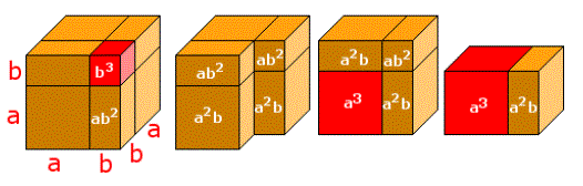 Giustificazione geometrica: un cubo di spigolo (a+b) il cui volume è (a+b)3 lo si può scomporre in:
