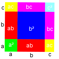 Giustificazione geometrica di questa regola: l'area del quadrato di lato (a+b+c) è uguale all'area del quadrato di lato a, più l'area del quadrato di lato b, più l'area del quadrato di lato c, più il doppio dell'area del rettangolo di dimensioni a e b, più il doppio dell'area del rettangolo di dimensioni a e c, più il doppio dell'area del rettangolo di dimensioni b e c.