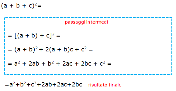 Il quadrato di un trinomio è uguale al quadrato del primo monomio, più il quadrato del secondo monomio, più il quadrato del terzo monomio, più il doppio prodotto del primo monomio per il secondo, più il doppio prodotto del primo monomio per il terzo, più il doppio prodotto del secondo monomio per il terzo. Ad esempio: