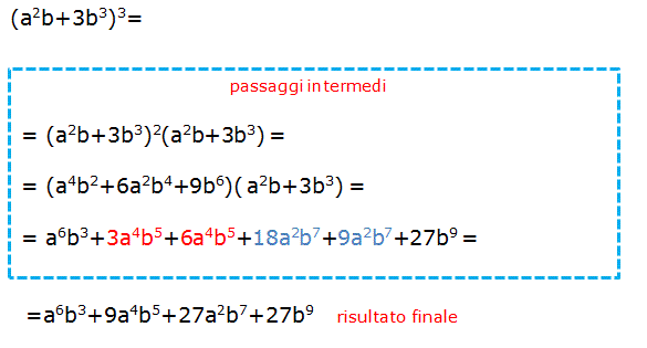Il cubo di un binomio è uguale al cubo del primo monomio, più il triplo prodotto del quadrato del primo monomio per il secondo monomio, più il triplo prodotto del primo monomio per il quadrato del secondo monomio, più il cubo del secondo monomio. Ad esempio: