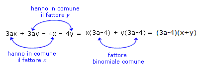 In questo caso è possibile procedere anche in un altro modo. Raccogliere 3a tra il primo e il secondo monomio e − 4 tra il terzo e il quarto e successivamente raccogliere il binomio comune (x + y). Ovviamente il risultato finale è lo stesso.