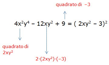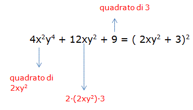 Se in un trinomio due termini sono quadrati di monomi e il terzo termine è il doppio prodotto delle rispettive basi allora possiamo scomporlo nel quadrato di un binomio. Ad esempio: