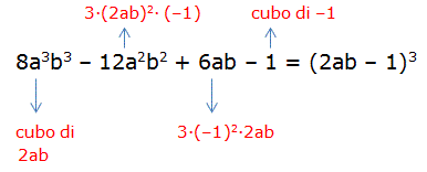 Se in un quadrinomio due termini sono cubi di monomi e gli altri due termine sono i tripli prodotti del quadrato di una delle due basi per l'altra allora possiamo scomporlo nel cubo di un binomio. Ad esempio: