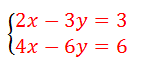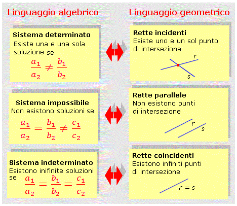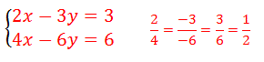 ) e quindi tutti i punti della retta rappresentano soluzioni del sistema. D'altronde se osserviamo le due equazioni del sistema possiamo renderci conto che sono equivalenti (la seconda equazione è stata ottenuta moltiplicando tutti i termini della prima equazione per 2). Le due rette sono coincidenti quando il rapporto fra i coefficienti di x è uguale al rapporto fra coefficienti di y ed è uguale anche al rapporto tra i coefficienti dei termini noti: