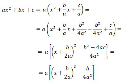 Se il discriminante è negativo (Δ < 0) l'equazione non ha soluzioni reali e quindi non possiamo scomporla in fattori di primo grado. Possiamo però esprimere il trinomio in una somma di due addendi mettendo a fattore comune il coefficiente a e poi aggiungendo e togliendo b2/4a2