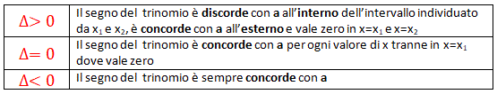 Riassumendo il segno di un trinomio ax2+bx+c si può dedurre considerando il segno del discriminante dell'equazione associata e il segno del suo primo coefficiente in questo modo: