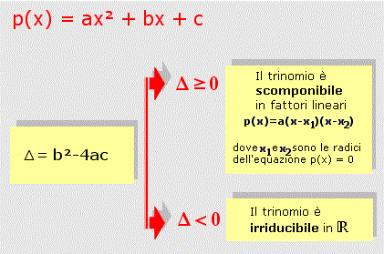 Se il discriminante dell'equazione associata è negativo l'equazione non ha radici reali e quindi il trinomio non ha zeri reali ed è irriducibile in R.