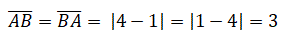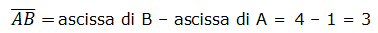 Naturalmente la distanza tra A e B deve essere uguale alla distanza tra B e A, ma, se invertiamo l'ordine dei termini della sottrazione, non otteniamo lo stesso valore e, per di più, otteniamo un numero negativo (1-4 = -3) il che non è accettabile perchè la distanza tra due punti, in quanto lunghezza di un segmento, deve essere un numero reale non negativo. Per evitare questo problema prenderemo il valore assoluto della differenza tra le ascisse degli estremi: