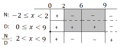 Consideriamo ora, lo schema dei segni riassuntivo tra numeratore e denominatore considerando solo i valori di x appartenenti al dominio della disequazione irrazionale fratta: