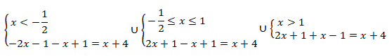 Risolviamo l'equazione |2x + 1| + |-x+1|= x + 4