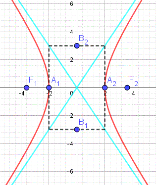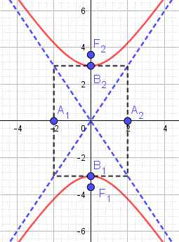 e i punti A1(-a, 0) e A2(a, 0) sono le intersezioni dell'iperbole con l'asse x e sono detti vertici reali dell'iperbole. L'iperbole non interseca l'asse y, tuttavia conviene prendere in considerazione i punti B1(0, -b) e B2(0, b) che sono detti vertici non reali dell'iperbole. Il segmento A1A2 è detto asse traverso, mentre il segmento B1B2 è detto asse non traverso. Se scriviamo l'equazione dell'iperbole sotto forma: