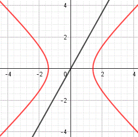 Poichè l'equazione risolvente è di primo grado, la retta è secante all'iperbole in un solo punto. Infatti risolvendo si ha: