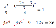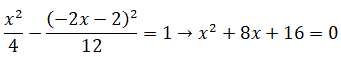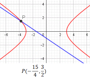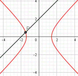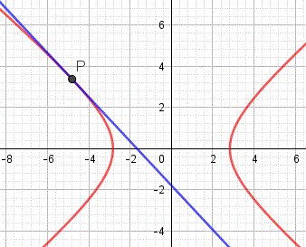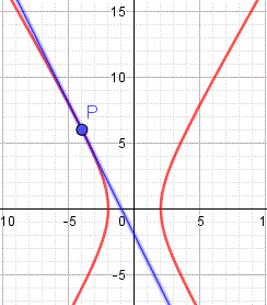 Il discriminante dell'equazione è Δ = 64 - 64 = 0 e quindi la retta è tangente all'iperbole. L'equazione risolvente ha per soluzione x = -4 e sostituendo questo valore nell'equazione della retta si ha y = 6. Pertanto la retta è tangente all'iperbole nel punto P(4, 6).