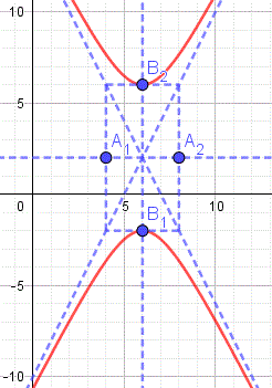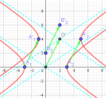 nella traslazione di vettore v(6, 2). Il centro di simmetria ha coordinate 0(6, 2), i vertici reali hanno coordinate B1(6, -2) e B2(6, 6) e quelli non reali A1(4, 2) e A2(8, 2). Gli asintoti hanno equazioni y=2x-10 ∨ y=-2x+14