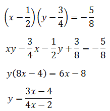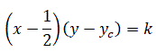 Consideriamo le coordinate del centro C dell'iperbole equilatera riferita ai propri asintoti traslata C(xc, yc) dove nel nostro caso xc=1/2. L'equazione dell'iperbole può essere scritta nella forma:
