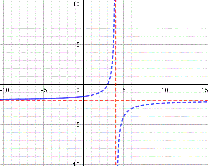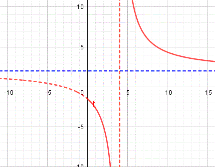 La seconda funzione del sistema rappresenta la parte di iperbole equilatera riferita ai propri asintoti traslata che si trova nel secondo e terzo quadrante, il suo centro di simmetria è C(4, -2) interseca l'asse y nel punti A(0, -3/2) e ha per asintoti x=4 e y=-2. Ecco il grafico: