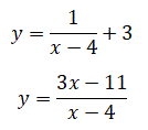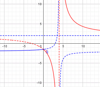 La prima funzione del sistema rappresenta la parte di iperbole equilatera riferita ai propri asintoti traslata che si trova nel primo e quarto quadrante, il suo centro di simmetria è C(4, 2) interseca l'asse y nel punti A(0, -3/2) e ha per asintoti x=4 e y=2. Ecco il grafico: