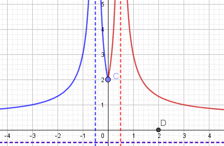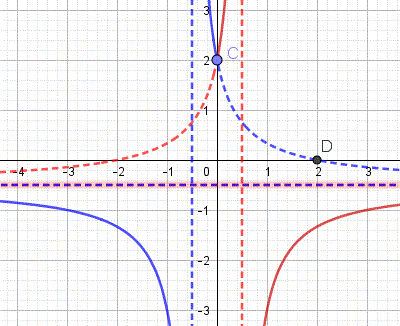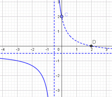 La seconda funzione del sistema rappresenta i rami di iperbole equilatera riferita ai propri asintoti traslata che si trova nel secondo e terzo quadrante, il suo centro di simmetria è C(-1/2, -1/2) interseca l'asse y nel punti C(0, 2) e l'asse x nel punto D(2, 0) e ha per asintoti x=-1/2 e y=-1/2. Ecco il grafico: