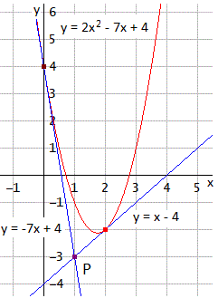 Ad esempio, determiniamo le tangenti alla parabola y = 2x2 - 7x + 4 passanti per il punto P(1, -3).