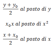Seconda formula: Detta formula di sdoppiamento permette di ottenere direttamente l'equazione della retta tangente alla parabola in un suo punto sostituendo nell'equazione della parabola: