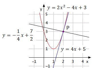 Ecco il grafico con parabola, retta tangente e retta normale nel punto P(2, 3):