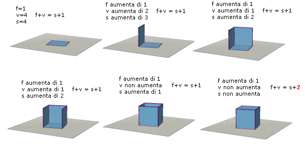 Giustifichiamo la formula considerando il caso di un cubo che costruiremo per gradi, aggiungendo via via una faccia; il nostro ragionamento può però facilmente estendersi a qualsiasi poliedro convesso. Osserva la seguente figura: