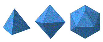 I poliedri corrispondenti prendono il nome di tetraedro regolare (4 facce, 4 vertici, 6 spigoli, ), ottaedro regolare (8 facce, 6 vertici, 12 spigoli), icosaedro regolare (20 facce, 12 vertici, 30 spigoli).