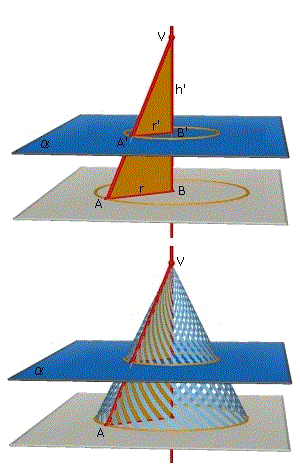 b) il rapporto r/r' tra i raggi della base e della sezione è uguale al rapporto h/h' dove h è l'altezza del cono e h' la distanza di V dal piano secante.