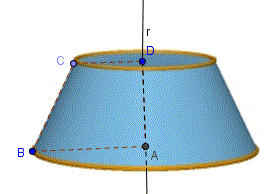 L'altezza del tronco di cono è la distanza AD tra le due basi; il segmento CB è l'apotema del tronco. E' chiaro infine che un tronco di cono può anche essere considerato come il solido generato dalla rotazione completa di un trapezio rettangolo ABCD attorno alla retta r su cui giace il lato perpendicolare alle basi del trapezio.