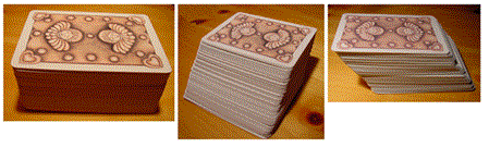 uno stesso mazzo di carte è stato disposto in modo diverso. Nel primo caso è disposto a parallelepipedo rettangolo, negli altri due casi a parallelepipedo obliquo (si fanno "scorrere" le carte l'una sull'altra). E' chiaro che i tre solidi hanno lo stesso volume perchè composti dallo stesso numero di carte tutte congruenti. Puoi pensare che tre carte, prese una per mazzo alla stessa quota rispetto al piano del tavolo, rappresentino le sezioni dei tre parallelepipedi con un piano parallelo al tavolo. Hai dunque una conferma empirica del principio di Cavalieri: le sezioni hanno la stessa area; nel nostro caso sono addirittura congruenti e i solidi hanno lo stesso volume. Il principio si basa sull'idea astratta di immaginare un solido composto da un numero grandissimo (tendente all'infinito) di strati paralleli sottilissimi (di altezza tendente a zero); e di immaginare che il volume possa ottenersi come "somma" di questi strati.