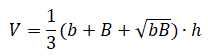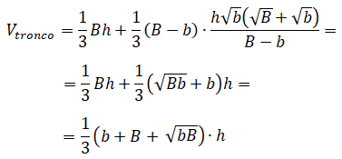 Teorema 25: La misura del volume di un tronco di piramide avente l'area di base maggiore B e l'area di base minore b e altezza h è dato dalla formula: