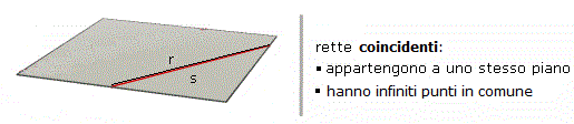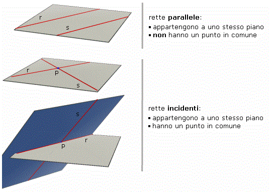 complanari se appartengono allo stesso piano; in tal caso possono essere parallele se non hanno punti in comune, incidenti se hanno un unico punto in comune, coincidenti se hanno infiniti punti in comune.
