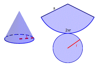 Anche per il cono ci avvarremo di un osservazione intuitiva, di tipo sperimentale. Immaginiamo che la superficie laterale di un cono sia di carta o di cartoncino flessibile e il cono sia cavo: possiamo tagliarla lungo una generatrice e lungo la circonferenza di base e distenderla su un piano (come avevamo già fatto per il cilindro). Quindi la superficie laterale di un cono, pur non appartenendo ad un stesso piano, può svilupparsi nel piano. Lo sviluppo della superficie laterale è un settore circolare il cui arco è lungo quanto la circonferenza di base del cono e il cui raggio è lungo quanto l'apotema del cono.