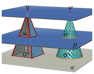 è facile rendersi conto che sezioni corrispondenti dei due solidi, relative ad un piano β parallelo ad α, sono equivalenti. Allora per il principio di Cavalieri i due solidi hanno lo stesso volume. Pertanto un cono avente raggio di base r e altezza h è equivalente a una piramide avente area di base Πr2 e altezza h: