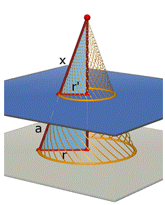 Indicando con r, r' ed a le misure del raggio della base maggiore, del raggio della base minore e dell'apotema del tronco e con x la misura dell'apotema del cono reciso, si ha