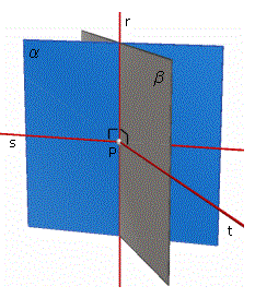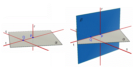 Teorema 4: Se una retta r è perpendicolare a due rette s e t che passano per un suo punto P allora ogni retta che passi per P e giaccia nel piano individuato da s e t è perpendicolare a r.
