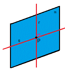 Ciò non è piò vero nello spazio. Infatti se consideriamo due rette r e s che giacciono nel piano α e perpendicolari in P possiamo considerare un piano β passante per la retta r e condurre una retta t giacente nel piano β e perpendicolare a r nel punto P.