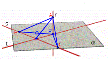 I due triangoli APB e APC sono congruenti perchè hanno AP in comune, BP ≅ CP per costruzione e gli angoli APB e APC retti, in quanto AP è perpendicolare ad α per ipotesi. Pertanto AB ≅ AC e nel piano ABC la retta AQ è asse di BC e quindi AQ è perpendicolare a BC ovvero a s. La retta s essendo perpendicolare alle rette PQ, AQ, sarà perpendicolare al piano da esse formate, che è lo stesso di quello formato da AP e da PQ.