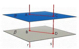 Siano AB e CD i due segmenti di perpendicolare staccati rispettivamente su r ed s dai due piani e mostriamo che AB è congruente a CD. Le rette r ed s sono parallele e appartengono dunque ad uno stesso piano γ a tale piano appartengono anche le rette AC e BD che, non avendo punti in comune, sono anch'esse parallele. Ne segue che ABDC è un rettangolo e dunque si ha:AB ≅ CD.