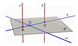Per il teorema delle tre perpendicolari u è perpendicolare in R al piano individuato da r e t (chiamiamo γ tale piano) ma anche al piano individuato da s e t (chiamiamo δ tale piano); ora i piani γ e δ, per il teorema 7, devono coincidere (altrimenti esisterebbero due piani distinti perpendicolari ad u in R. Ne segue che r, s e t sono complanari. Ma sappiamo che in un piano due rette perpendicolari ad una stessa retta sono parallele.