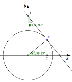 Consideriamo la circonferenza goniometrica, l'angolo α, il corrispondente punto P sulla circonferenza goniometrica, la tangente in A(0, 1) e prolunghiamo il segmento OP fino a intersecare la tangente nel punto B.