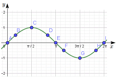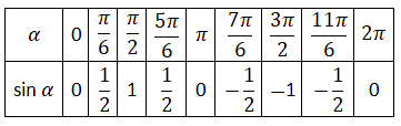 Inoltre essendo la funzione periodica di periodo 2kΠ con k ∈ Z è sufficiente tracciare il grafico nell'intervallo [0, 2Π] e poi completarlo ripetendo periodicamente sia a sinistra che a destra la parte del grafico già tracciato. Iniziamo a costruiamo la tabella α e sin α scegliendo alcuni opportuni angoli: